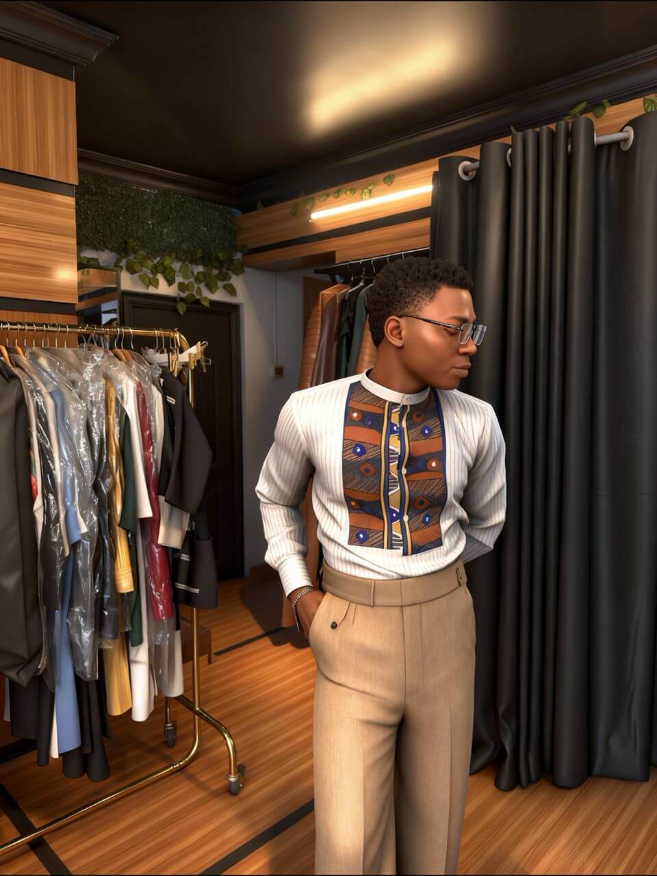 Crisp white long-sleeve striped shirt featuring a bold brown, blue, and gold mosaic patterned yoke panel with button accents. High stand collar and clean cuffs for refined style. Completed with tailored high-waisted beige trousers. A modern African-inspired fusion for effortless sophistication.