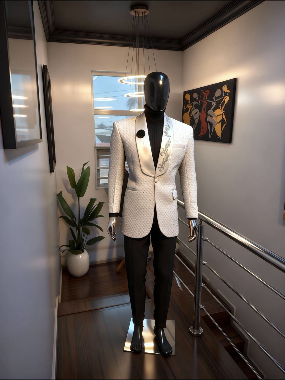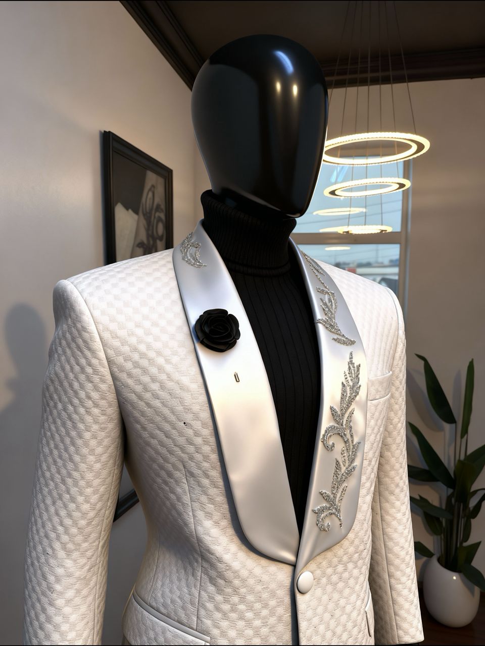 Sleek white textured blazer featuring shimmering silver vine embroidery along the shawl lapel, a diamond-accented brooch with chain detail, and single-button closure. A luxurious fusion of elegance and edge for the modern icon.