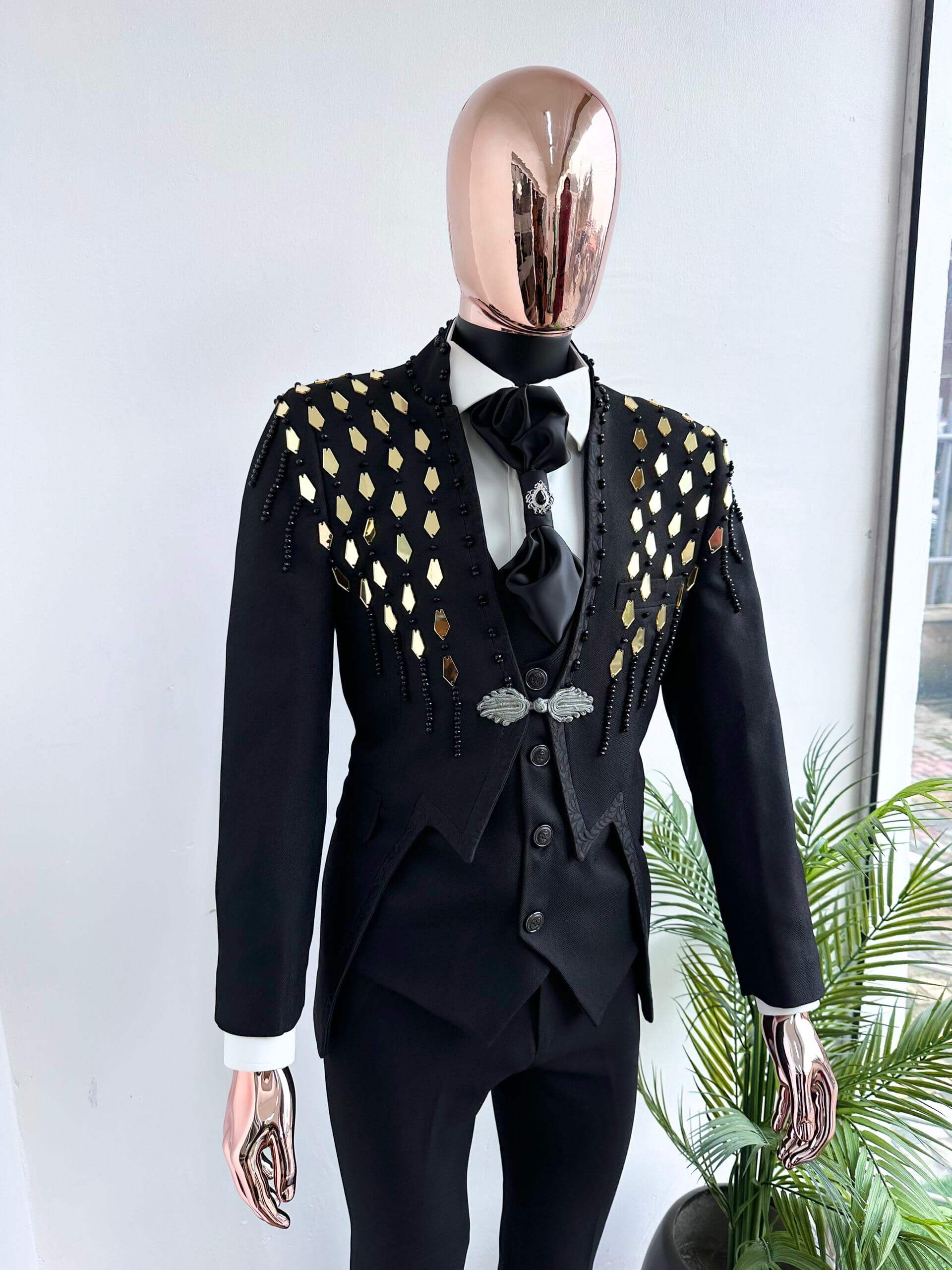 Golden Rain Black & Gold Embellished 3-Piece Tuxedo