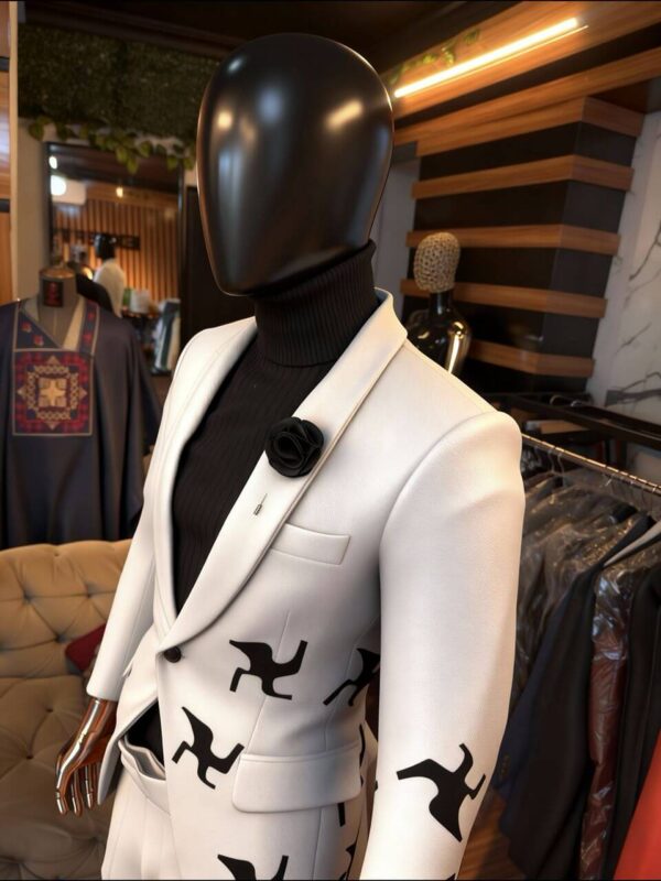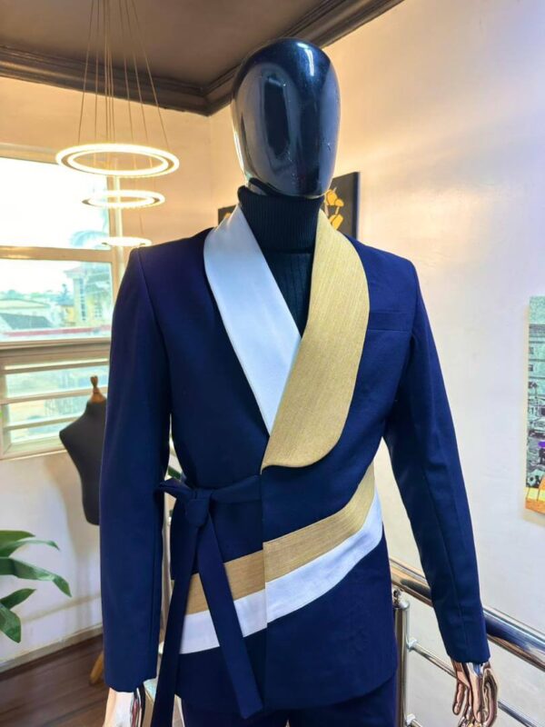 Striking diagonal colour-block kaftan in premium Italian crepe viscose. Jet black and crisp ivory panels outlined with deep wine piping, mandarin collar, long sleeves, and side slits for easy movement. Paired with tailored slim black trousers for a complete, sharp look.