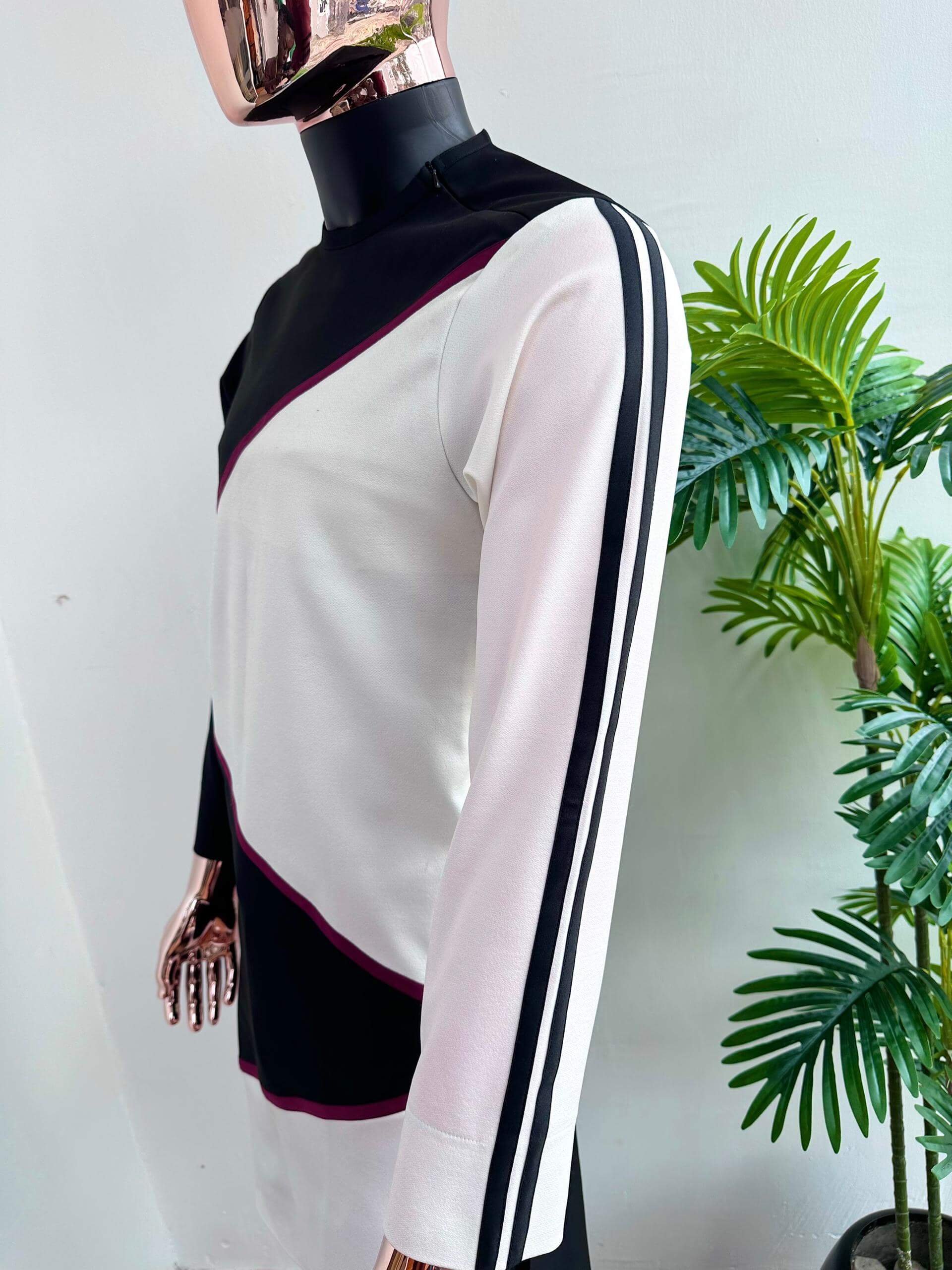 - Details: Bold diagonal black/ivory colour-block with wine piping, long sleeves, side slits